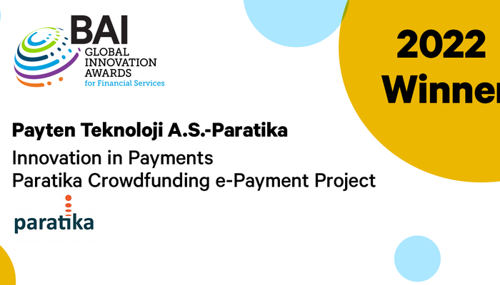 Dünyanın dört bir köşesinde faaliyet gösteren finans şirketlerinin katıldığı, küresel çapta en inovatif finansal hizmet projelerinin ödüllendirildiği ve bu yıl 12.’si gerçekleşen BAI 2022 Küresel İnovasyon Ödülleri’nde finale kalan 27 finans şirketi arasından seçilen, Paratika’nın “Paya Dayalı Kitle Fonlama Online Ödeme Altyapısı” Türkiye'de ilk olma özeliği taşırken dünyada da ilk 10’da yer alıyor. Paratika BAI 2022 Küresel İnovasyon Ödülleri’nde bu yıl Türkiye’den ödül alan tek firma oldu.